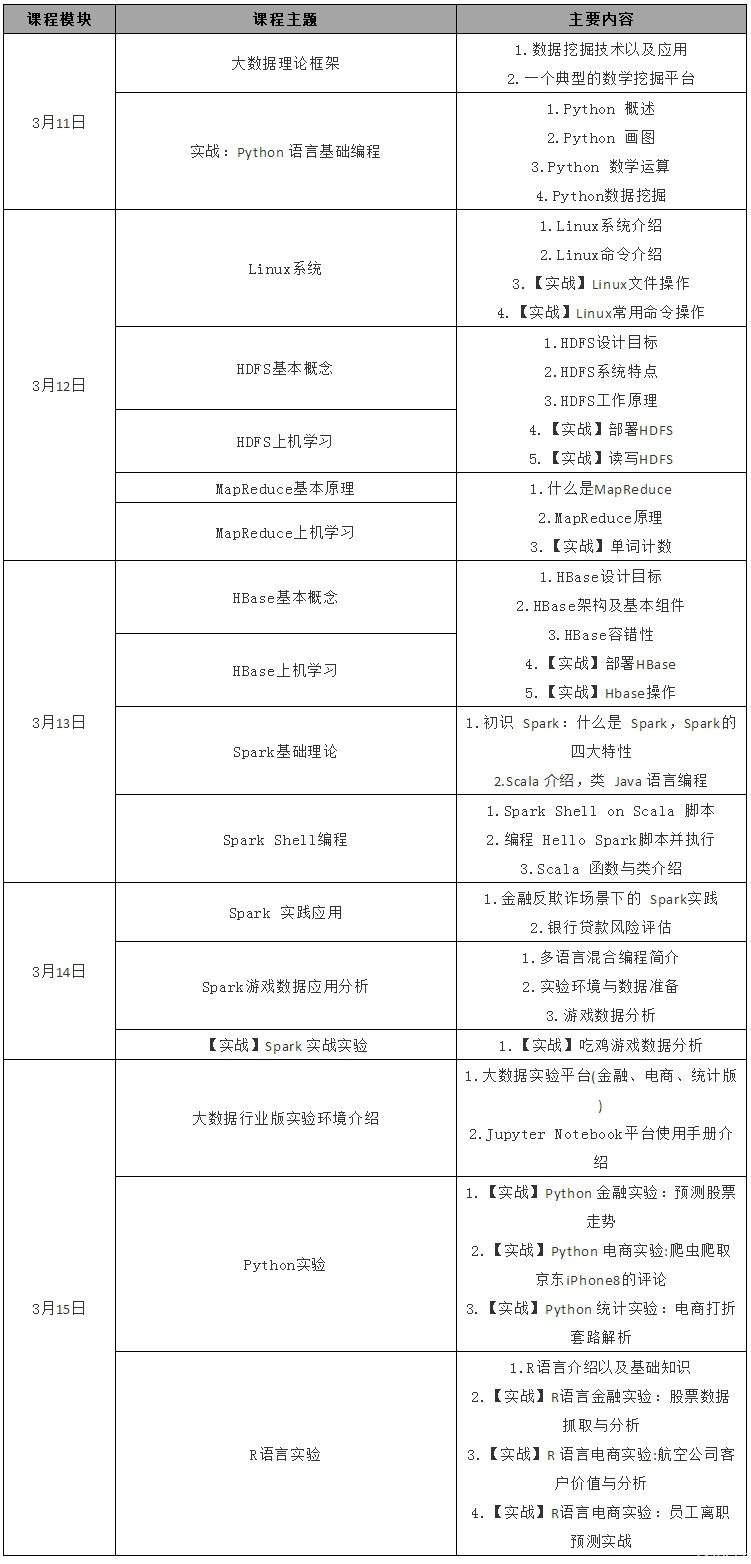 2019大數(shù)據(jù)、人工智能實戰(zhàn)培訓班將分別于3月10日-16日、3月17日-23日在南京舉辦。培訓采用面授+實戰(zhàn)+答疑的形式,“一站式”解決大數(shù)據(jù)、人工智能專業(yè)實踐中提高動手能力和實踐水平面臨的問題。(學員需攜帶裝有Win7、Win10的64位操作系統(tǒng)的電腦參加實訓)