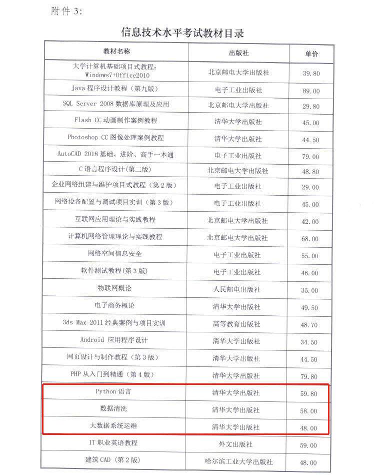 近日,工業(yè)和信息化部教育與考試中心印發(fā)了“2019年上半年信息技術(shù)水平考試工作安排的通知”,公布了2019年上半年信息技術(shù)水平考試科目及考試時(shí)間、工作日程安排以及教材目錄等。其中,由劉鵬教授主編、清華大學(xué)出版社出版的“大數(shù)據(jù)應(yīng)用人才培養(yǎng)系列教材”中的《Python語(yǔ)言》、《數(shù)據(jù)清洗》、《大數(shù)據(jù)系統(tǒng)運(yùn)維》三冊(cè)圖書同時(shí)入選“2019年上半年信息技術(shù)水平考試教材目錄”。