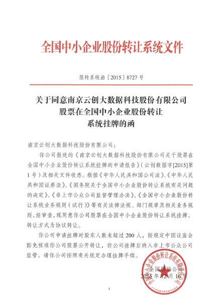 1.成功掛牌新三板(股票名稱:云創(chuàng)數(shù)據(jù),股票代碼:835305)