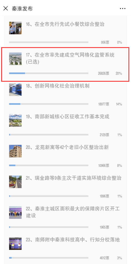 在評選過程中,秦淮區(qū)宣傳部廣泛調動全區(qū)廣大干部群眾積極參與投票評選。連續(xù)7天的投票評選,30條候選條目累計獲得投票13萬多張。其中,在投票過程中,秦淮區(qū)空氣質量網(wǎng)格化監(jiān)管系統(tǒng)始終獲得參選干部群眾的青睞。