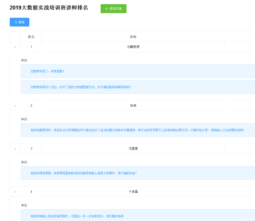 培訓(xùn)過后,由學(xué)員對(duì)本次授課的講師進(jìn)行了打分與評(píng)價(jià),授課老師均得到學(xué)員們的好評(píng),學(xué)員們?cè)u(píng)價(jià)講師思路清晰、技術(shù)過硬,講解深入淺出、細(xì)致耐心,并因此獲得了很棒的學(xué)習(xí)體驗(yàn)。