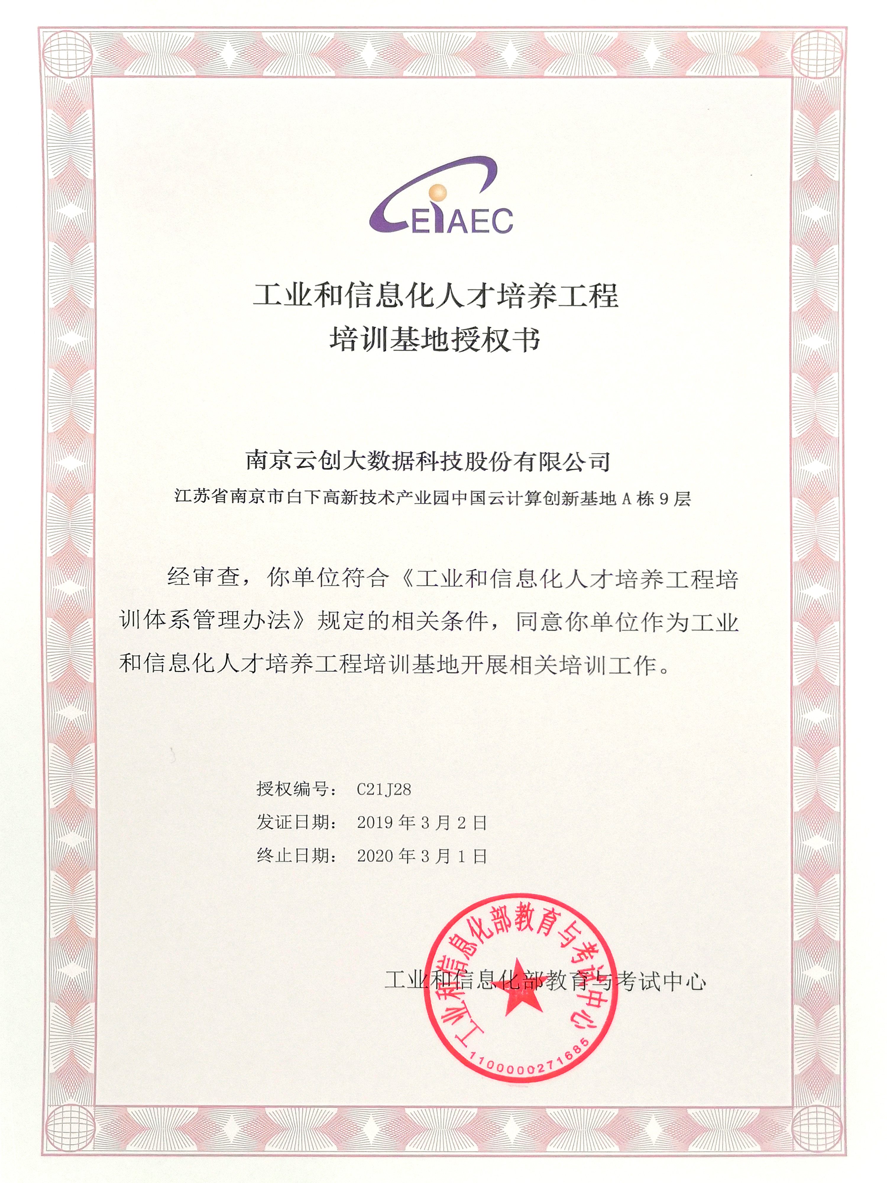 近日,經(jīng)嚴(yán)格審核,云創(chuàng)大數(shù)據(jù)符合《工業(yè)和信息化人才培養(yǎng)工程培訓(xùn)體系管理辦法》的相關(guān)條件,獲得工業(yè)和信息化部教育與考試中心批準(zhǔn),作為“工業(yè)和信息化人才培養(yǎng)工程培訓(xùn)基地”開(kāi)展相關(guān)培訓(xùn)。