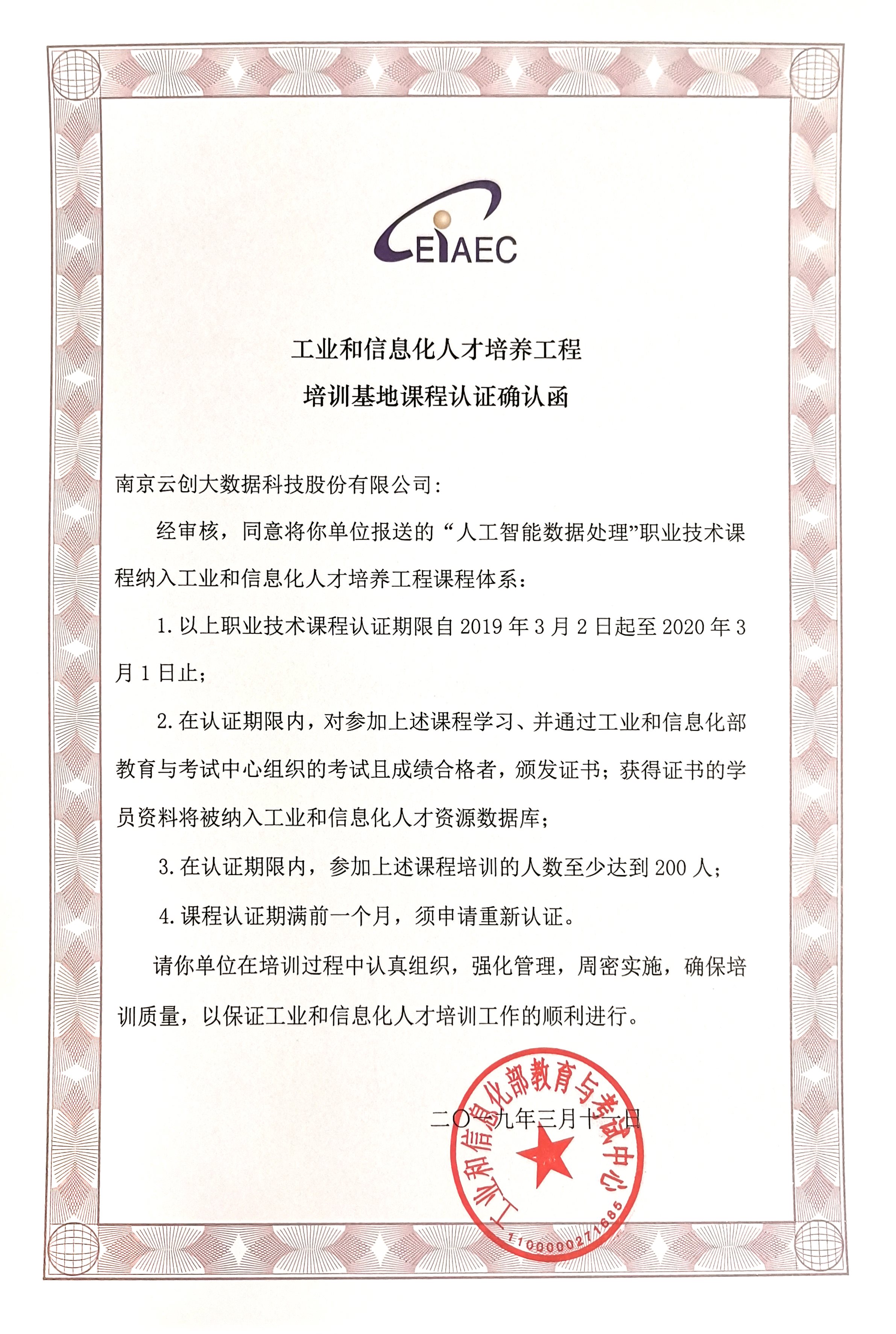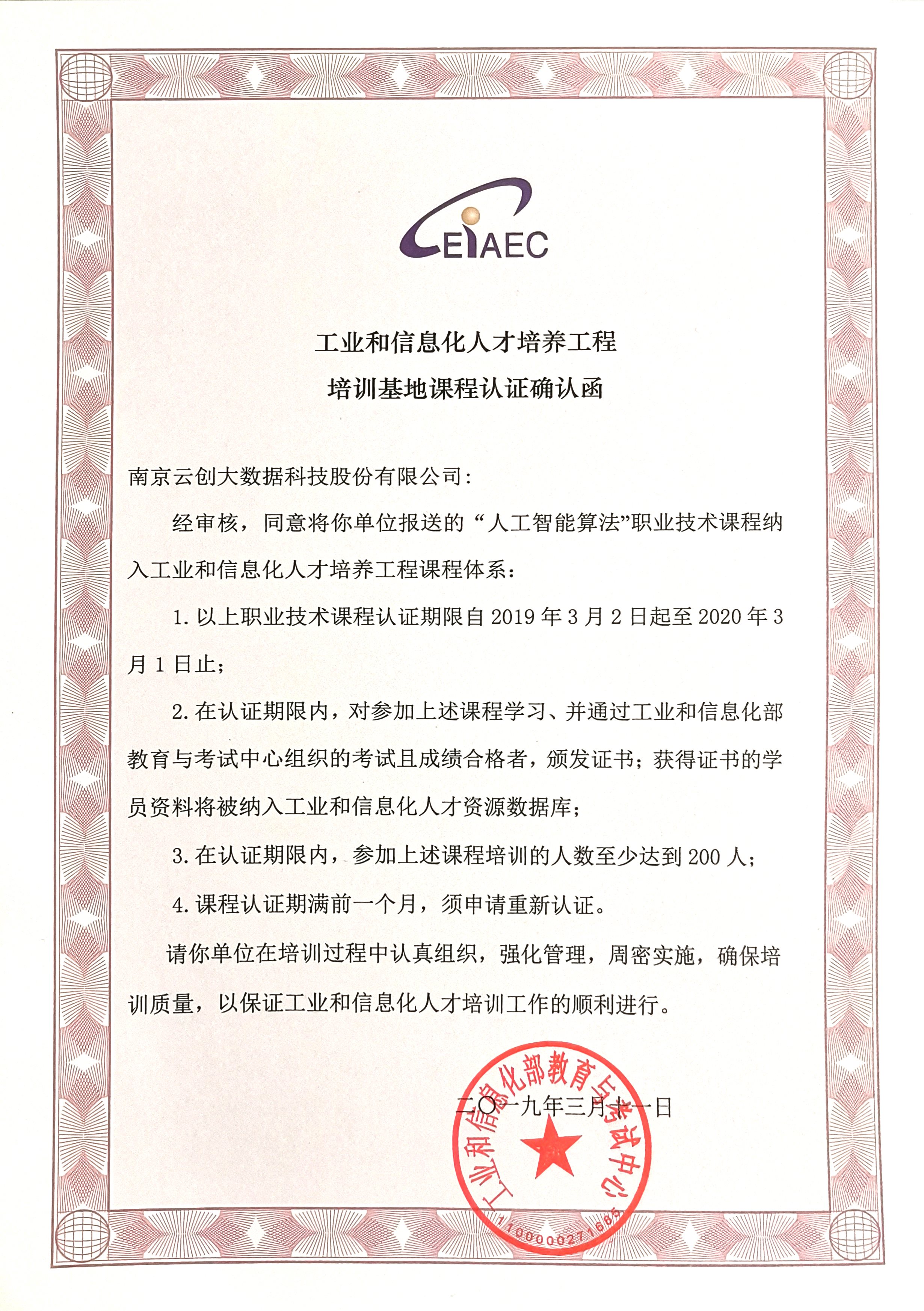 同時(shí),云創(chuàng)大數(shù)據(jù)報(bào)送的“人工智能算法”與“人工智能數(shù)據(jù)處理”職業(yè)技術(shù)課程被納入了工業(yè)和信息化人才培養(yǎng)工程課程體系,可針對(duì)社會(huì)人員進(jìn)行職業(yè)技術(shù)課程培訓(xùn),并為通過(guò)考試的人員發(fā)放證書(shū),相應(yīng)的學(xué)員資料也將被納入工業(yè)和信息化人才資源數(shù)據(jù)庫(kù)。