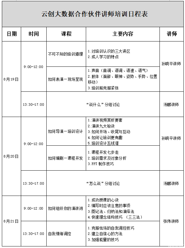 隨著社會經(jīng)濟發(fā)展,行業(yè)競爭日益激烈,如何培訓(xùn)員工,并迅速提升員工的工作技能,越來越受到企業(yè)的重視。一個現(xiàn)代企業(yè)核心競爭力的打造,靠的也是企業(yè)這種持續(xù)的學(xué)習(xí)能力。為建立健全云創(chuàng)大數(shù)據(jù)培訓(xùn)體系,提升合作伙伴講師、市場等人員的的授課和培訓(xùn)能力,更好地為客戶服務(wù),促進銷售業(yè)績的提升,云創(chuàng)大數(shù)據(jù)合作伙伴講師培訓(xùn)將于8月19日正式拉開序幕。歡迎各合作伙伴報名參加!