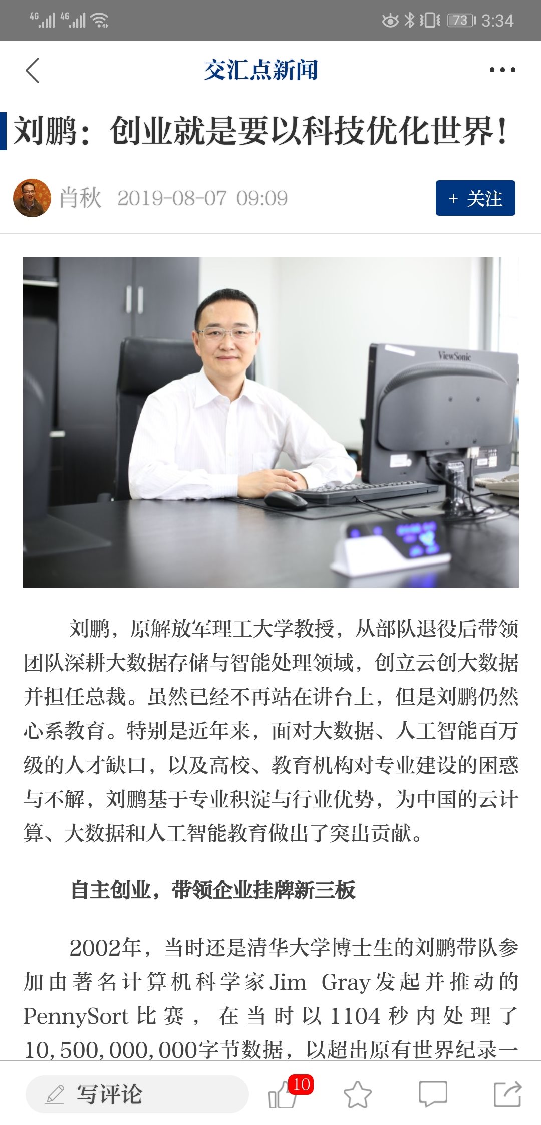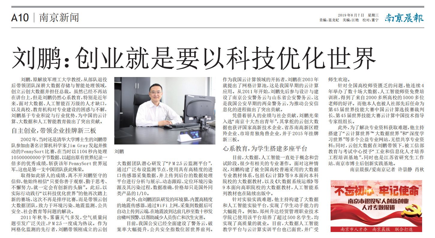 8月7日,《南京晨報(bào)》A10版“不忘初心、牢記使命——南京市退役軍人創(chuàng)新創(chuàng)業(yè)人才專題”對(duì)原解放軍理工大學(xué)教授、清華大學(xué)博士、中國(guó)大數(shù)據(jù)應(yīng)用聯(lián)盟人工智能專家委員會(huì)主任、云創(chuàng)大數(shù)據(jù)總裁劉鵬教授進(jìn)行了大篇幅報(bào)道。該篇文章《劉鵬:創(chuàng)業(yè)就是要以科技優(yōu)化世界》圍繞“自主創(chuàng)業(yè),帶領(lǐng)云創(chuàng)掛牌新三板”和“心系教育,為學(xué)生搭建多座平臺(tái)”,對(duì)劉鵬教授的創(chuàng)新創(chuàng)業(yè)經(jīng)歷進(jìn)行了詳細(xì)介紹。全文如下: