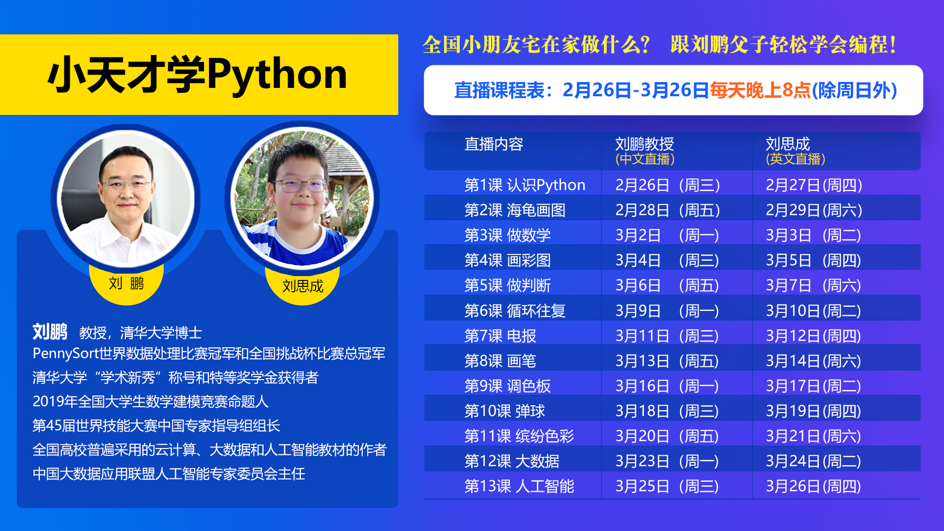 2020年寒假很漫長,特別是隨著各地的大專院校、中小學(xué)、幼兒園紛紛推遲開學(xué),開學(xué)時間仍然待定。停課不停學(xué),宅在家的朋友們一起跟隨劉鵬教授父子輕松學(xué)習(xí)編程吧!