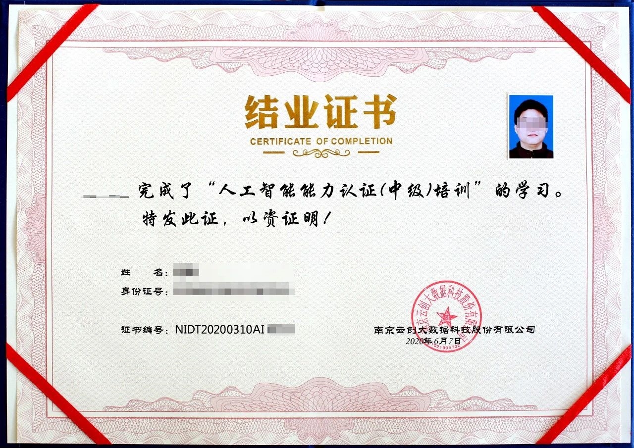 對于參加培訓(xùn)的學(xué)員,完成培訓(xùn)統(tǒng)一頒發(fā)“結(jié)業(yè)證書”;通過云創(chuàng)認(rèn)證考試且成績合格,才能獲得“人工智能能力認(rèn)證(中級)證書”,以此作為專業(yè)技術(shù)人員職業(yè)能力考核的證明。在培訓(xùn)結(jié)束后,可在云創(chuàng)大數(shù)據(jù)官方網(wǎng)站查詢“人工智能能力認(rèn)證(中級)證書”信息。