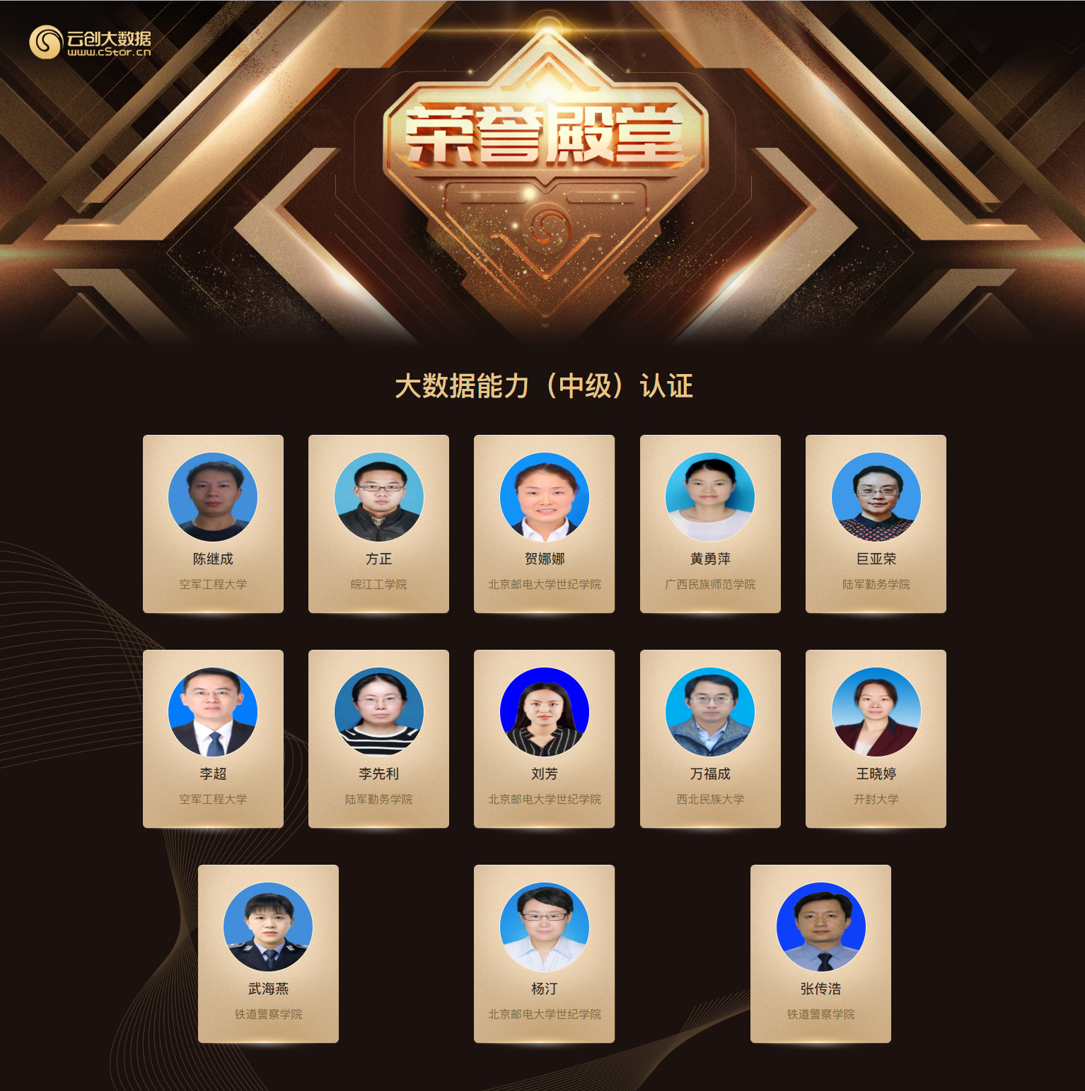 以下為3月23日-4月19日大數(shù)據(jù)能力認證(中級)培訓已經(jīng)確認將獲得認證證書的學員名單,還有名單在陸續(xù)添加和更新中,可在榮譽殿堂(http://edu.cstor.cn/#/honor)查看詳細名單。