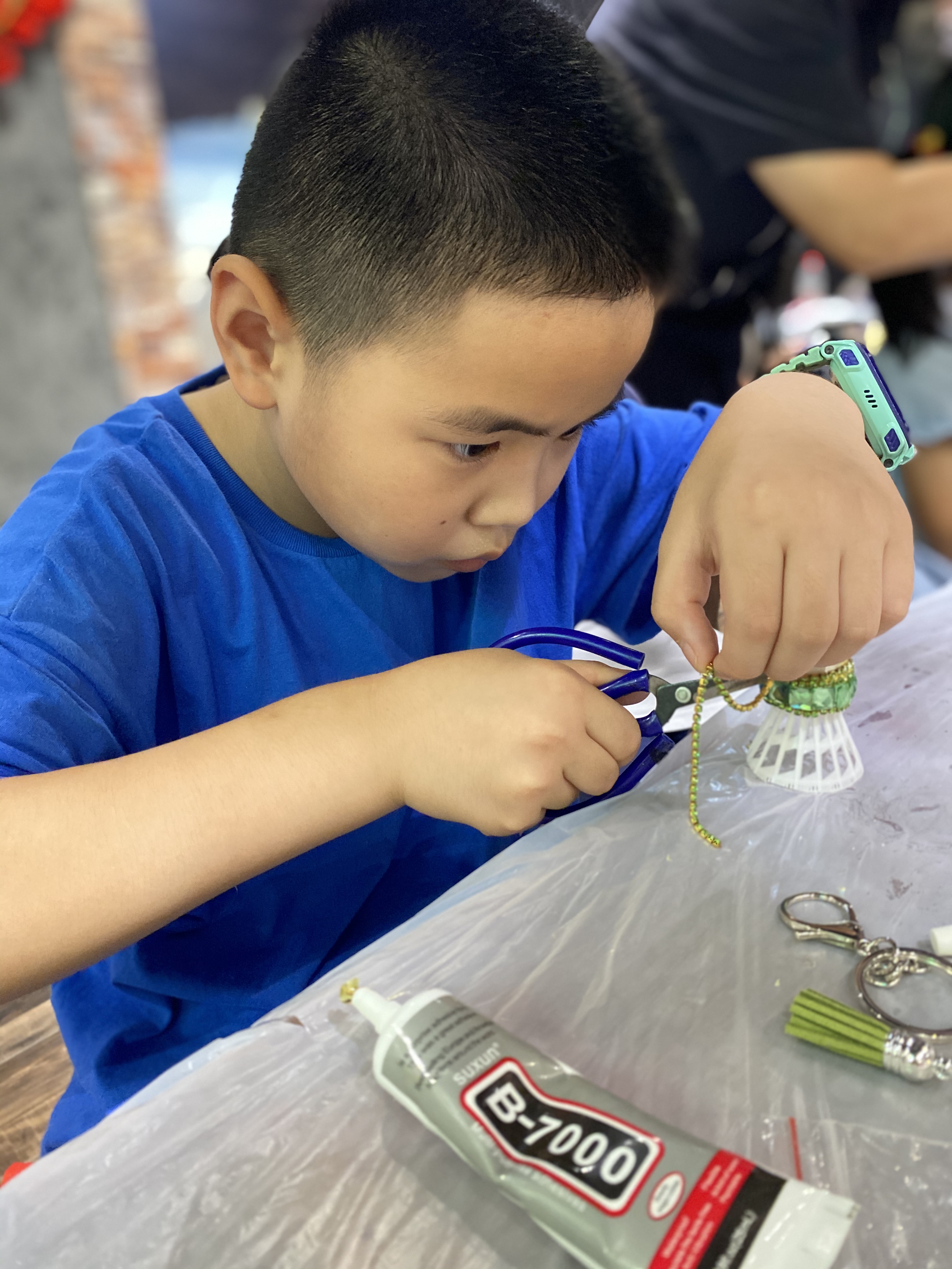 在集趣坊——手工作坊進行的羽毛球鑰匙扣制作受到了孩子們的熱烈歡迎。在手工老師的指導(dǎo)幫助下,孩子們發(fā)揮出出彩的動手能力,制作出一個個精美的鑰匙扣。