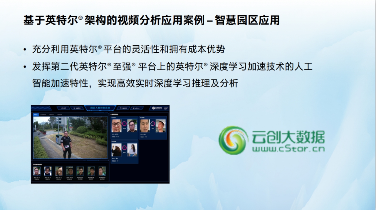 值得一提的是,云創(chuàng)大數(shù)據(jù)的智慧園區(qū)人臉識別系統(tǒng)、鐵路病態(tài)非接觸檢測系統(tǒng)這兩款熱門產(chǎn)品,在市場上收獲行業(yè)用戶的頗多好評。其實,這兩款產(chǎn)品都是云創(chuàng)大數(shù)據(jù)前沿應(yīng)用結(jié)合英特爾先進(jìn)技術(shù)成功落地的人工智能具體實例。此外,在云創(chuàng)大數(shù)據(jù)參與的新冠肺炎疫情走勢預(yù)測中,也離不開英特爾提供的人工智能技術(shù)支持。