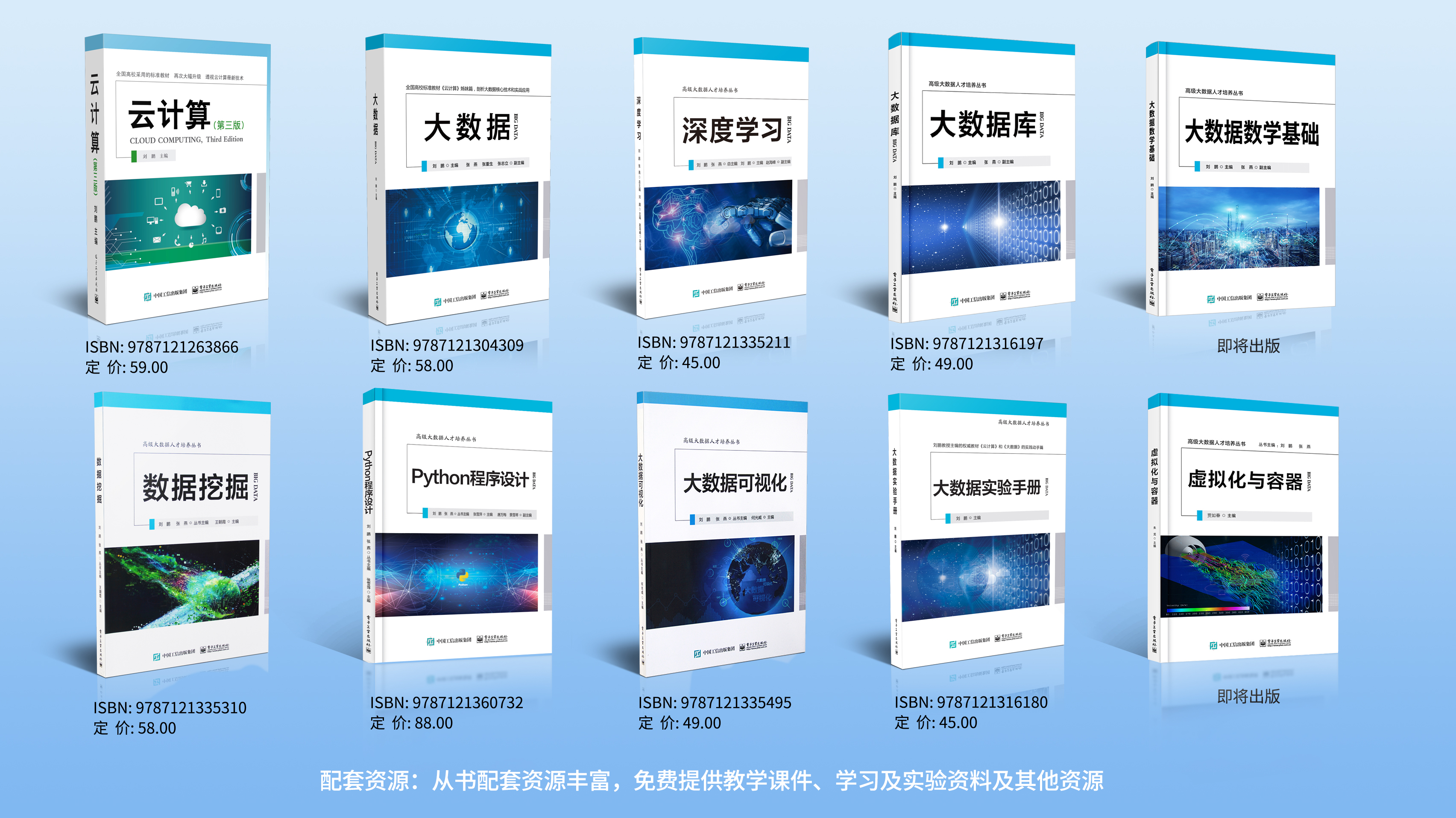 具體而言,“高級大數(shù)據(jù)人才培養(yǎng)叢書”包含《云計算》、《大數(shù)據(jù)》、《深度學(xué)習(xí)》、《大數(shù)據(jù)庫》、《大數(shù)據(jù)數(shù)學(xué)基礎(chǔ)》《數(shù)據(jù)挖掘》、《Python程序設(shè)計》、《大數(shù)據(jù)可視化》、《大數(shù)據(jù)實驗手冊》、《虛擬化與容器》,可為大數(shù)據(jù)本科教學(xué)提供系統(tǒng)幫助。其中,《云計算》長年名列中國計算機(jī)圖書被引用量前列,據(jù)知網(wǎng)評價微信公眾號(微信號:cnkipj)《【工學(xué)】高被引圖書前三甲,你讀過嗎?》報道,2010年至2014年《云計算》位居中國高被引圖書自動化技術(shù)、計算機(jī)技術(shù)類別第一名。
