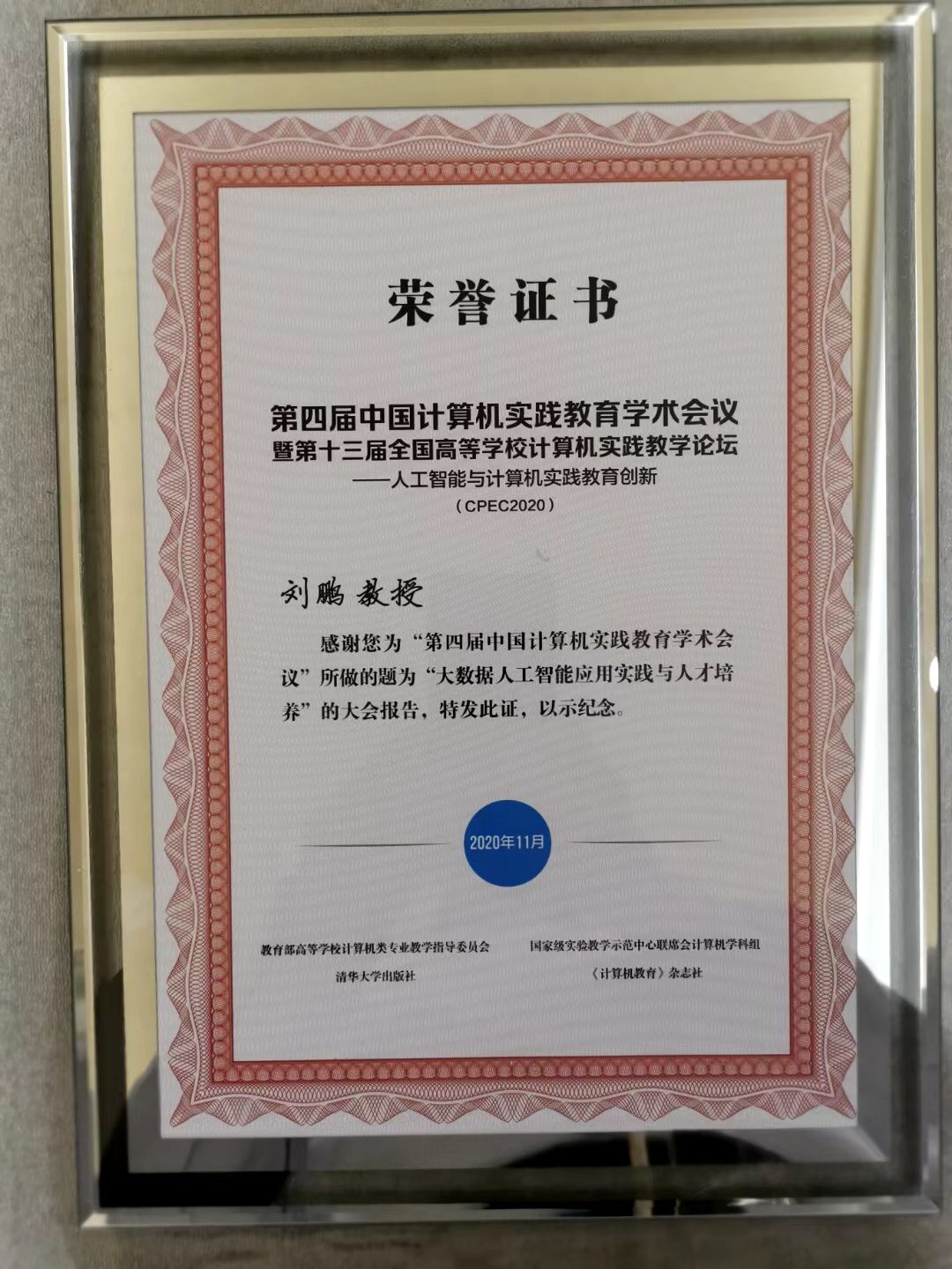 11月7日上午,清華大學(xué)博士、南京大數(shù)據(jù)研究院院長、中國大數(shù)據(jù)應(yīng)用聯(lián)盟人工智能專家委員會(huì)主任、中國信息協(xié)會(huì)教育分會(huì)人工智能教育專家委員會(huì)主任、云創(chuàng)大數(shù)據(jù)總裁劉鵬教授為論壇作了報(bào)告分享——“大數(shù)據(jù)人工智能應(yīng)用實(shí)踐與人才培養(yǎng)”,主辦方為其頒發(fā)榮譽(yù)證書予以感謝。
