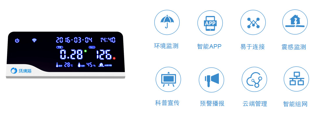 據(jù)統(tǒng)計(jì),地球上每年約發(fā)生500多萬(wàn)次地震,大概每天要發(fā)生上萬(wàn)次的地震,小震不可怕,關(guān)鍵是大震威脅,如果能夠及時(shí)感知地震發(fā)生并發(fā)出預(yù)警,將大幅度減輕人員傷亡。在國(guó)家減震防災(zāi)工作指導(dǎo)下,云創(chuàng)大數(shù)據(jù)開發(fā)了具備自主知識(shí)產(chǎn)權(quán)的環(huán)境貓室內(nèi)空氣監(jiān)測(cè)儀,不僅具有地震預(yù)警功能,同時(shí)也能對(duì)甲醛、PM2.5、溫度、濕度等進(jìn)行實(shí)時(shí)監(jiān)測(cè),一舉多得。