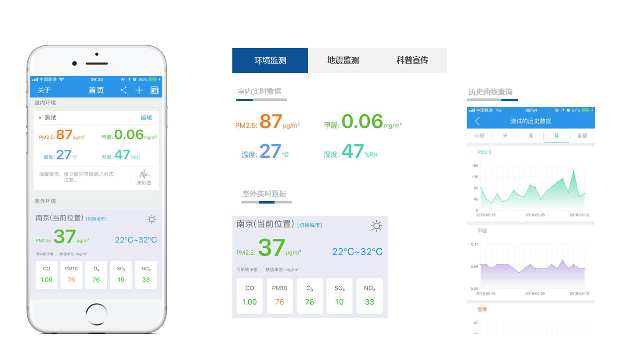 24小時(shí)監(jiān)測(cè)地震、甲醛、PM2.5等,即使出差在外,也能隨時(shí)隨地通過(guò)手機(jī)APP查看地震與室內(nèi)空氣質(zhì)量。