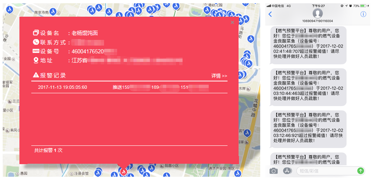 - 當(dāng)燃?xì)鉂舛瘸^閾值時(shí),紅色點(diǎn)跳動(dòng)并發(fā)出報(bào)警鳴叫,點(diǎn)擊報(bào)警設(shè)備點(diǎn)即可查看該報(bào)警設(shè)備的基本信息、報(bào)警次數(shù)、報(bào)警時(shí)間。同時(shí),業(yè)主、街道安全員與運(yùn)維人員也將收到以短信或電話語音形式發(fā)送的通知,及時(shí)知曉燃?xì)庑孤肚闆r。