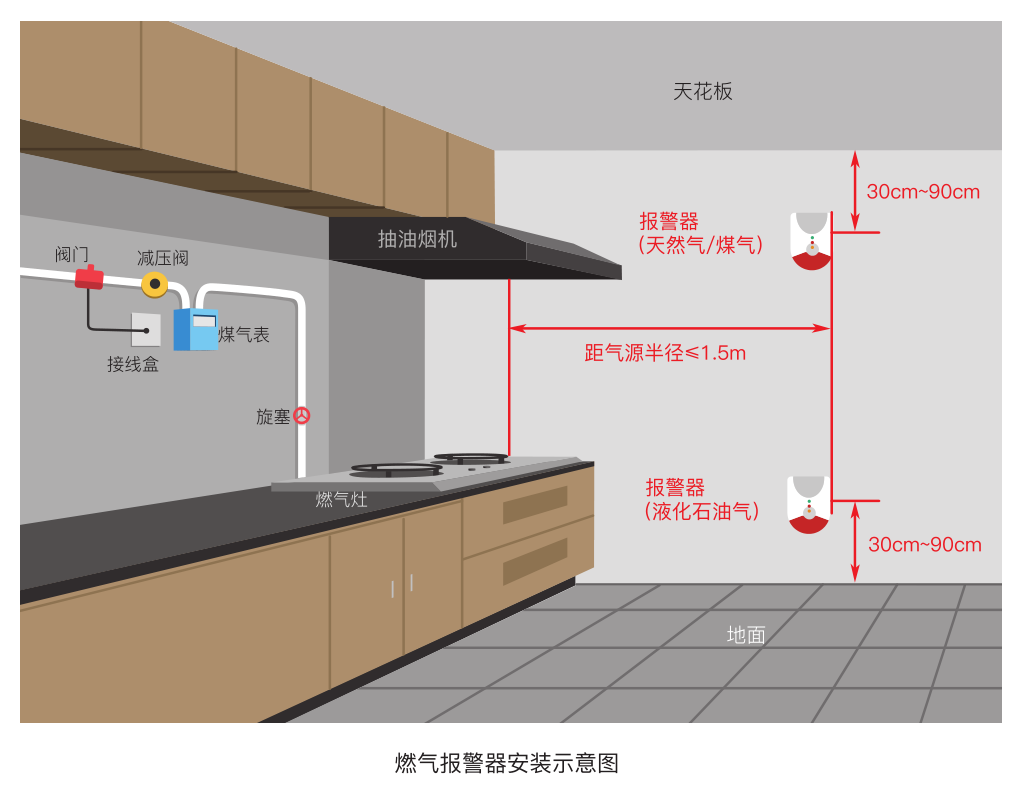 2.液化石油氣(比空氣重):建議安裝在離地面0.3-0.9米,距氣源半徑1.5米以內(nèi)。