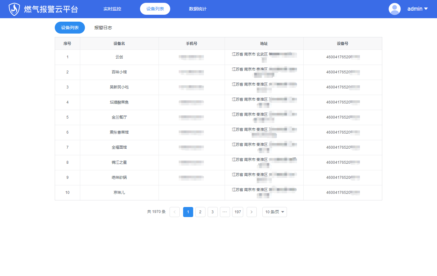 管理員通過PC端和移動(dòng)端,可完成設(shè)備的添加、修改和刪除等,選擇某一具體設(shè)備點(diǎn),將展示該設(shè)備的詳細(xì)信息(設(shè)備名、聯(lián)系方式、設(shè)備號(hào)、地址)和報(bào)警記錄。