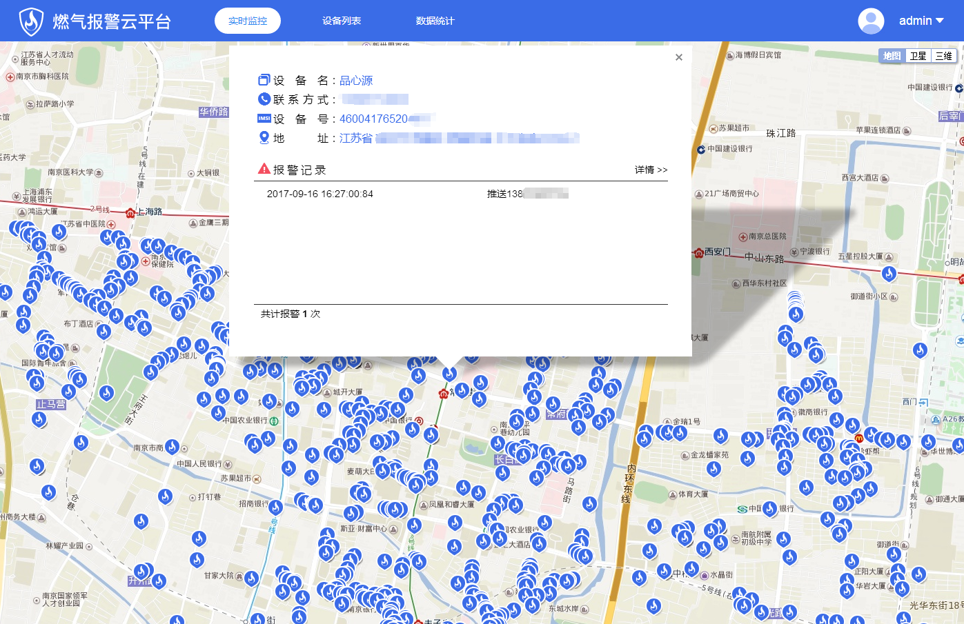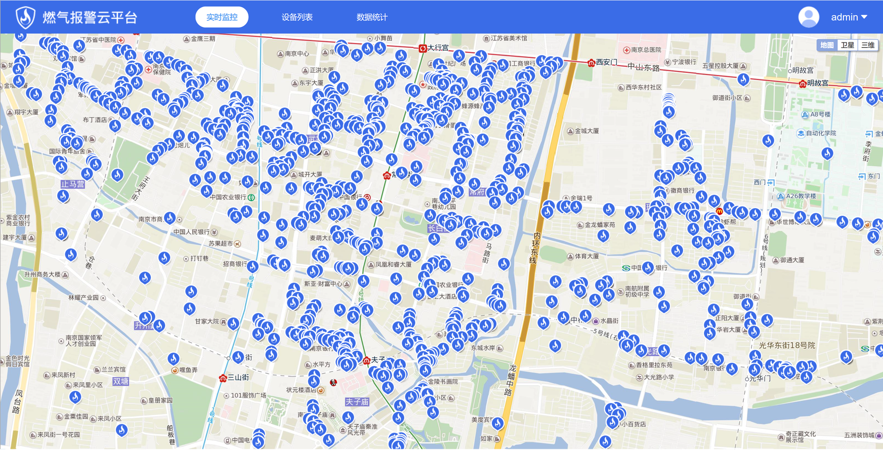 - 平臺(tái)支持地圖展示功能,標(biāo)注了平臺(tái)內(nèi)所有燃?xì)鈭?bào)警監(jiān)控點(diǎn)位信息,以不同顏色區(qū)分設(shè)備的不同狀態(tài),藍(lán)色代表設(shè)備在線、灰色代表設(shè)備離線、紅色代表設(shè)備報(bào)警,并進(jìn)行日常管理。