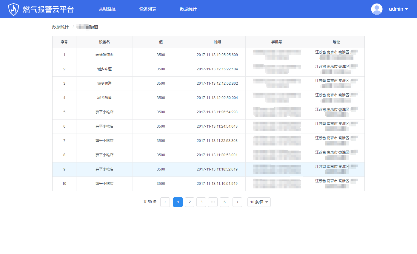 選擇具體街道,可查看當(dāng)前街道所有報(bào)警記錄信息,包括設(shè)備名稱、閾值、時(shí)間、手機(jī)號(hào)、地址。